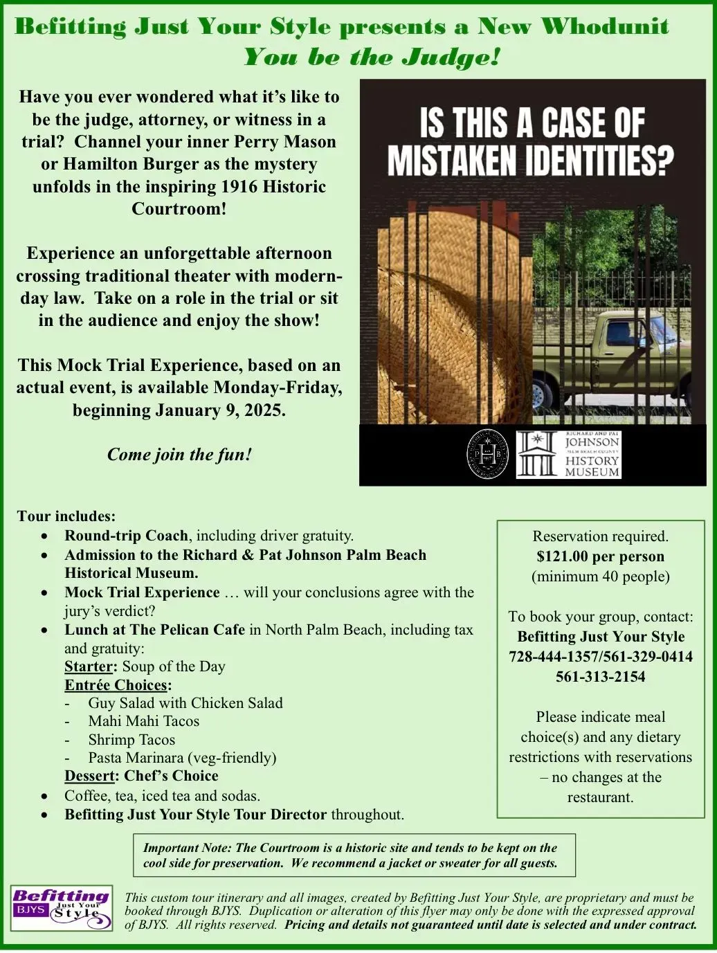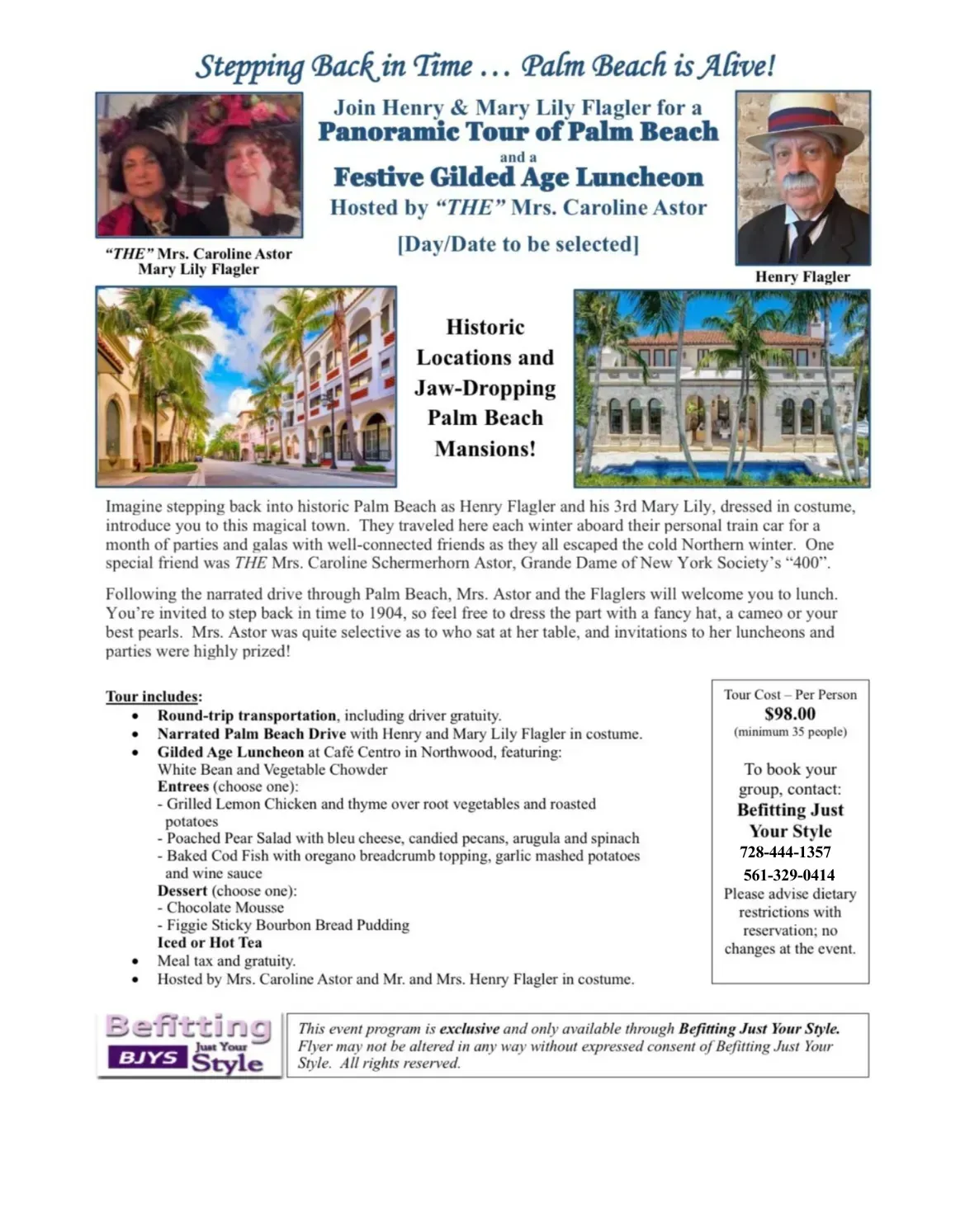 Narrated by our guides, Lilly Mary and Henry Flagler, onboard our bus tour of this famous city, Palm Beach, you’ll learn about the historic locations and the development of a town where the wealthy of the day flocked to for the “season.” A surprise miniplaylet will be presented with Lunch following the tour.