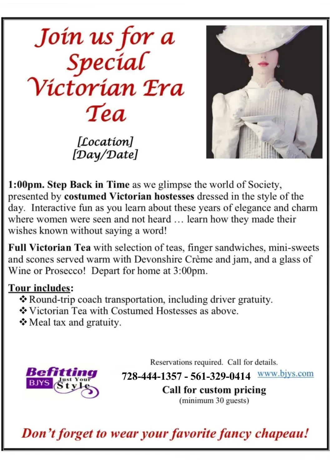 Creating great memories of an era of elegance and propriety ..find out some of the REAL HISTORY where women were seen and never heard. Costumed in their finest, the hostesses of this playlet help reenact and relive what it was like to be a Victorian Lady. Filled with history of gossip of this time, you’ll enjoy a “spot of Tea” and all the goodies that were part of this grand tradition of the day.
