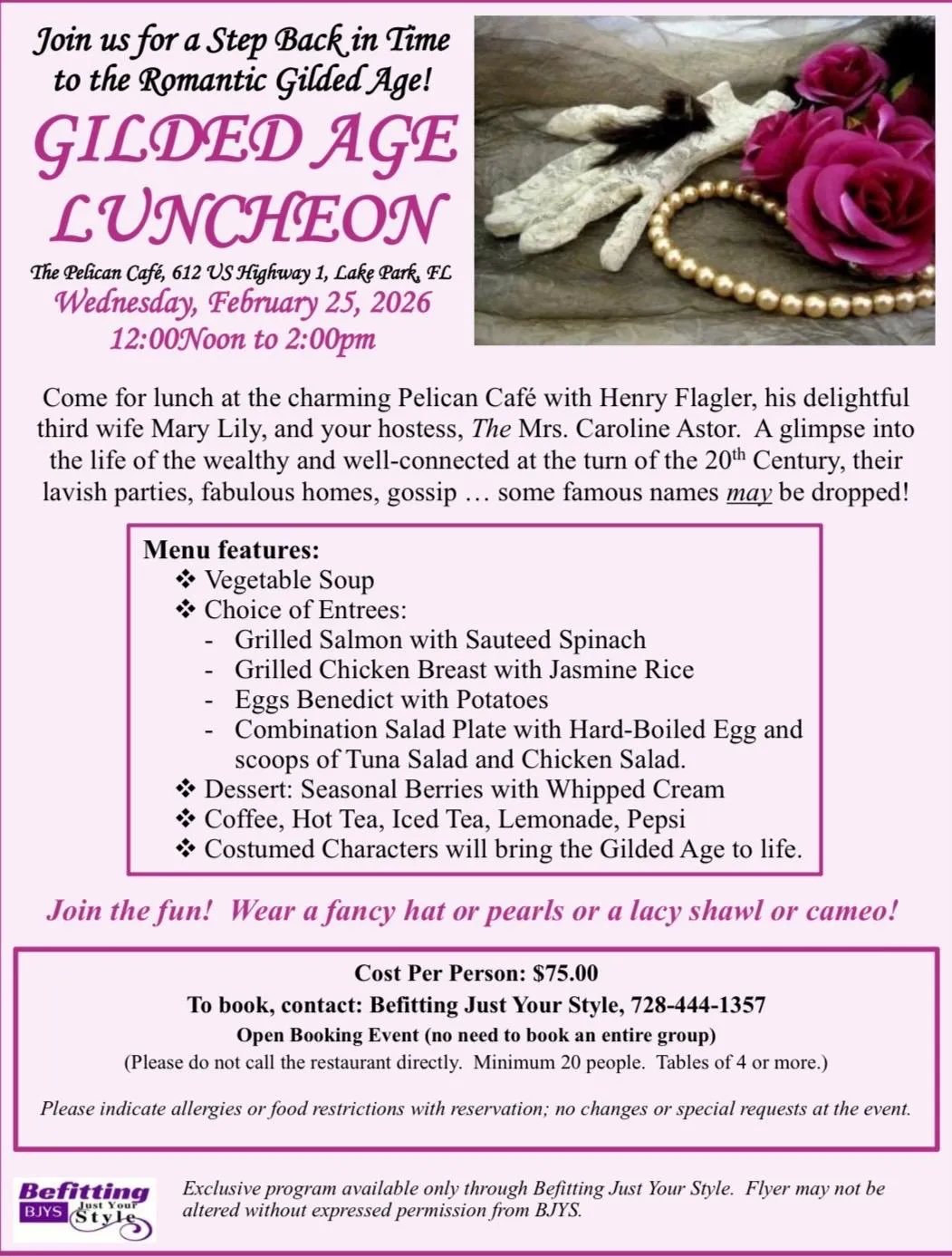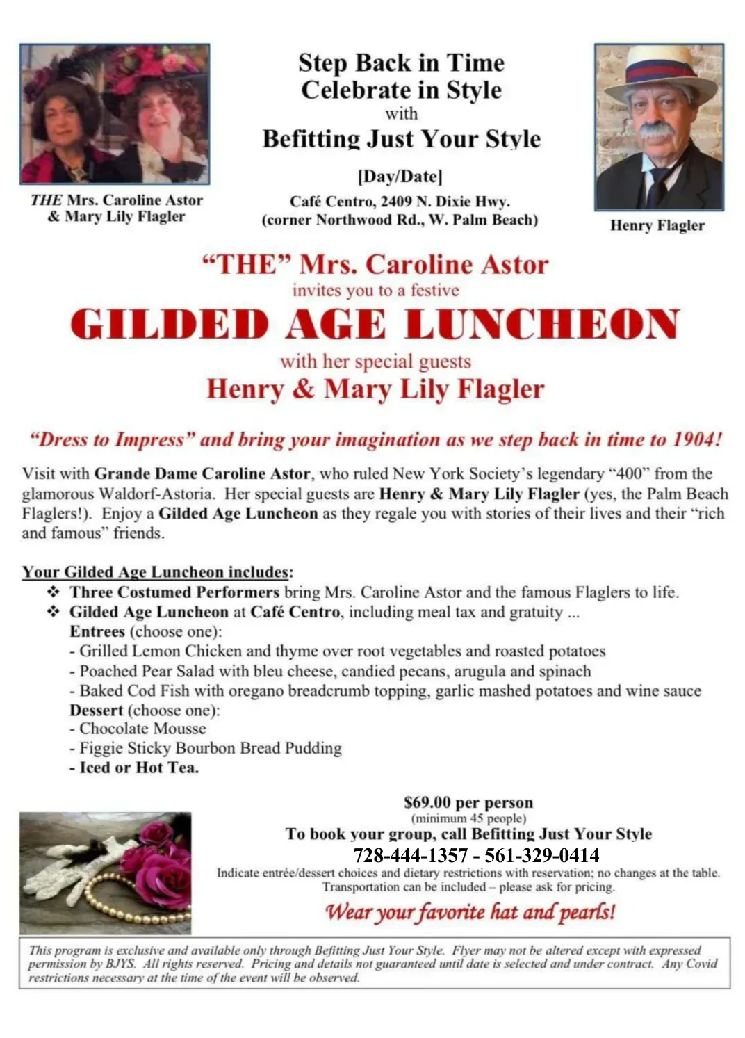 Step Back in Time to the Turn of the Century when decorating the arm of your husband was still the goal of the day. There was no middle class and Henry Flager and his third wife, Mary Lilly, were entertaining guests at Whitehall, their Florida residence. Henry Flagler was also credited for bringing the first tourists to enjoy the warm climate on his railroad. Attired in the clothing in the clothing of 1904, you will ramp through this fun review and of course enjoy a lovely luncheon.