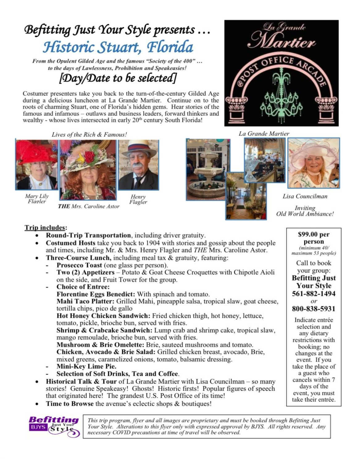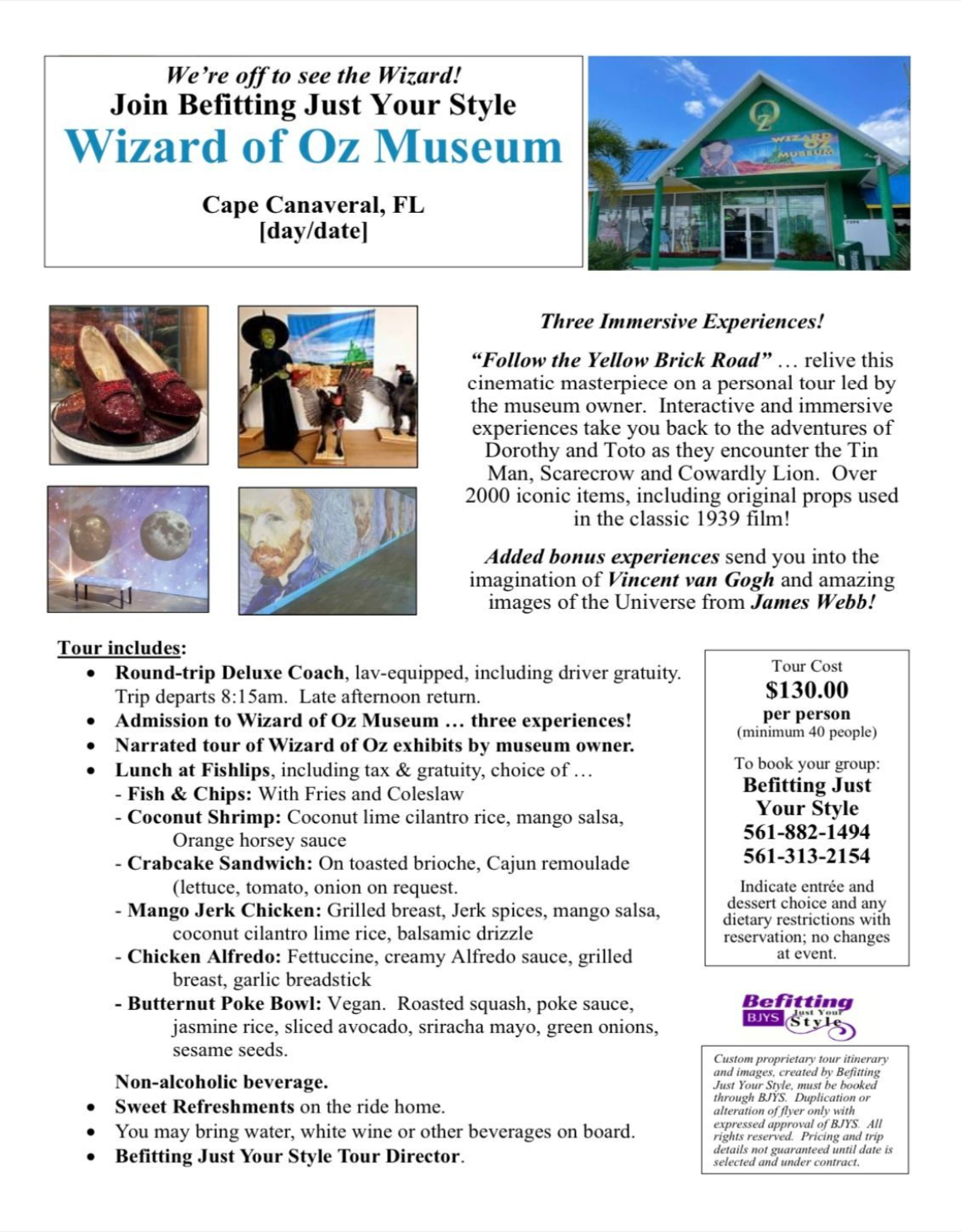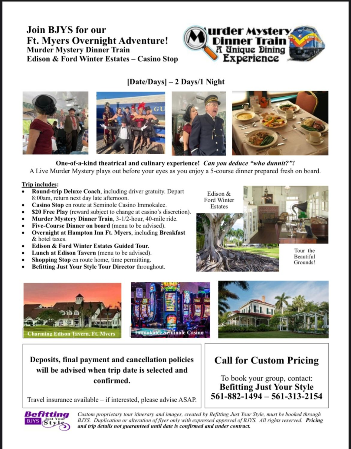 With 35 years of experience, our goal is to work with groups and organizations to offer an outstanding experience. All trips and tours can be customized to your group's, club's, or organization’s satisfaction. Our company offers day trips, overnights, and trips of several days duration. We take pride in offering unique, cultural, historical, and educational tours and trips. Your group or individuals can now take advantage of our “open bookings.”. This concept enables small groups or individuals to join and reserve space for some of our group bookings that are not filled to capacity. Our pricing is all-inclusive, with no hidden fees. We will customize your trip or tour to fit your group’s needs. We will also create an individualized flyer for your trip or tour with the name of your group, date, and who to call in your group for reservations. Transportation is included, unless otherwise requested. We work with multiple bus companies, so we are able to accommodate groups as small as 12 and up to 55. It is our policy to provide an escort or guide with each trip to ensure that everything runs smoothly since Befitting Just Your Style set up the program. Additionally, some of our programs can be brought to your location or off-site at another venue.